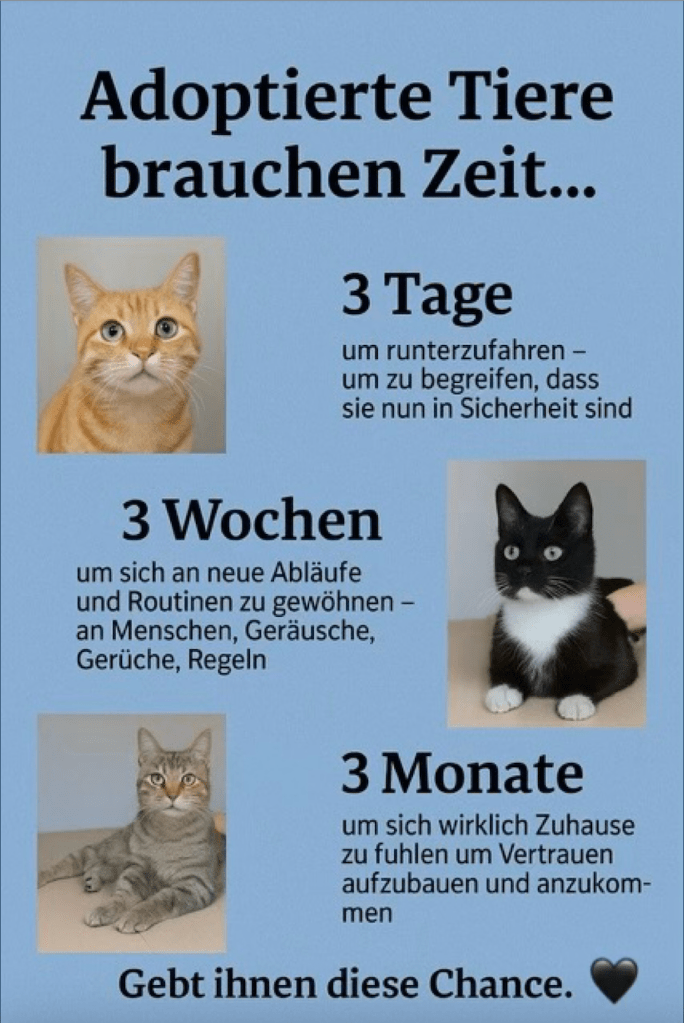 … mit Fotos und den Fakten, die wir über das bisherige Leben des Tieres erfahren konnten. Wir beschreiben den Charakter, die Sozialverträglichkeit etc. und weisen bei nahezu allen Tieren darauf hin, dass wir Katzen ausschließlich im „Doppelpack“ oder zu einer bereits im Haushalt lebenden Katze vermitteln. Zudem sehen wir in der Bereitstellung einer Katzenklappe, die wir als unabdingbar erachten, die Freiheit und somit den freiheitsliebenden Individualcharakter der Katze wertgeschätzt und gestützt.