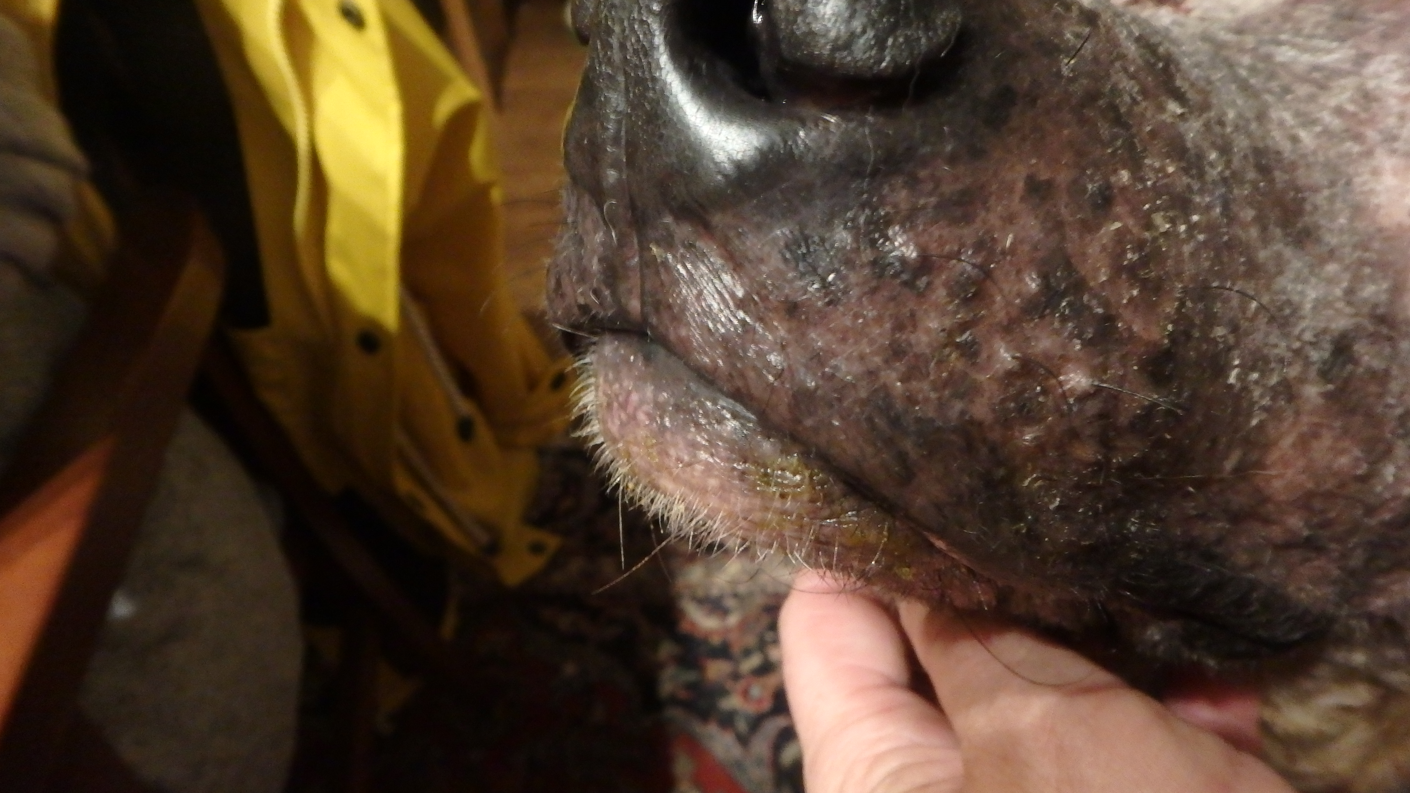 Wicker hat Leishmaniose, zusätzlich eine Autoimunerkrankung, die dazu beiträgt, dass sein Fell kaum noch vorhanden und die Haut trocken und rissig ist. Die Pflegestelle bemüht sich nach Kräften: der 26kg Hund wird zweimal die Woche gebadet, um den Juckreiz zu lindern und die Haut zu beruhigen. Es wird eine Milteforanbehandlung gestartet, um die aktive Leishmaniose einzudämmen. Die Blutwerte müssen ständig kontrolliert werden, da einige Werte nicht im Normalbereich liegen, d.h., die Pflegestelle muss häufig zum Tierarzt.