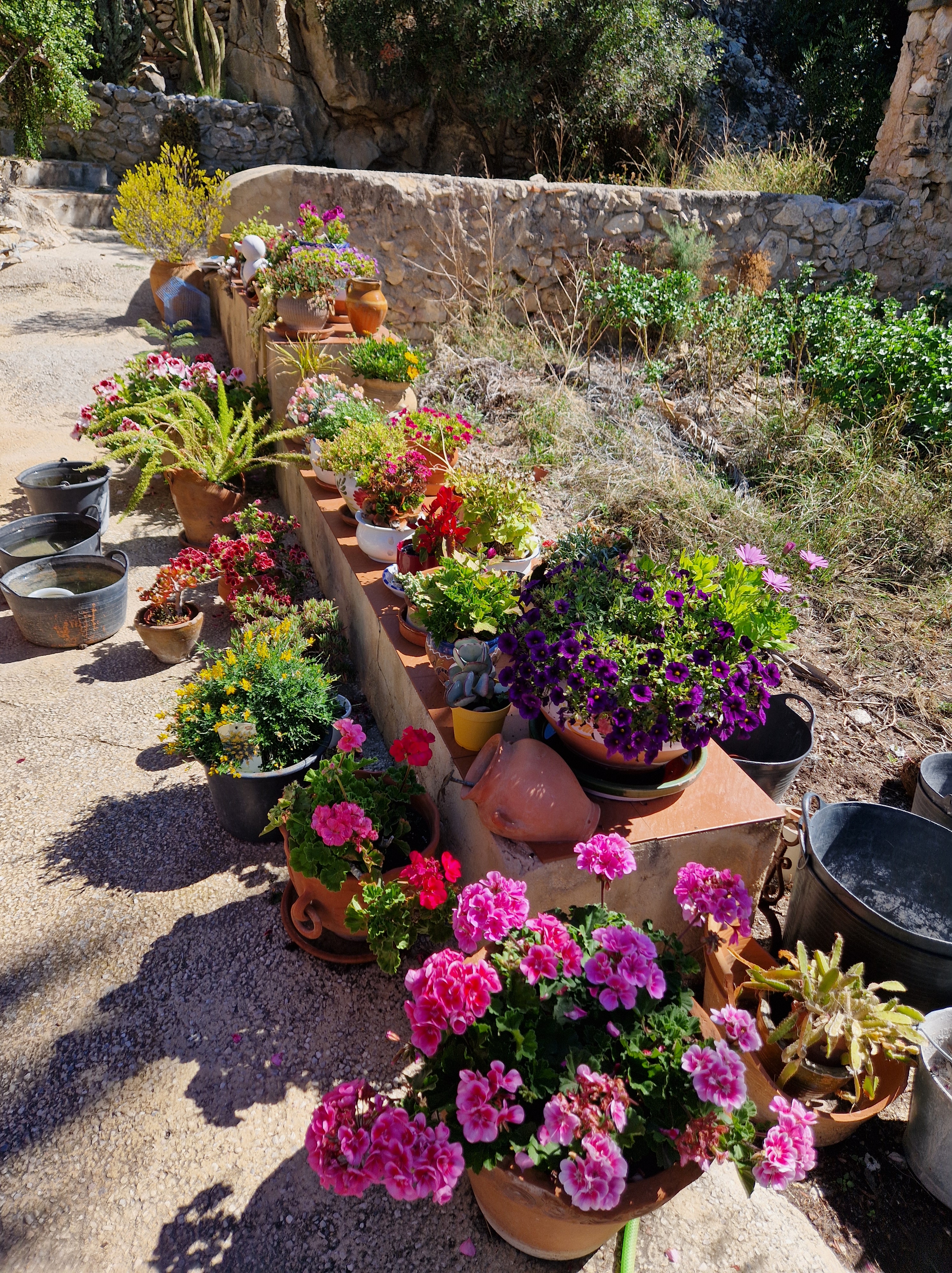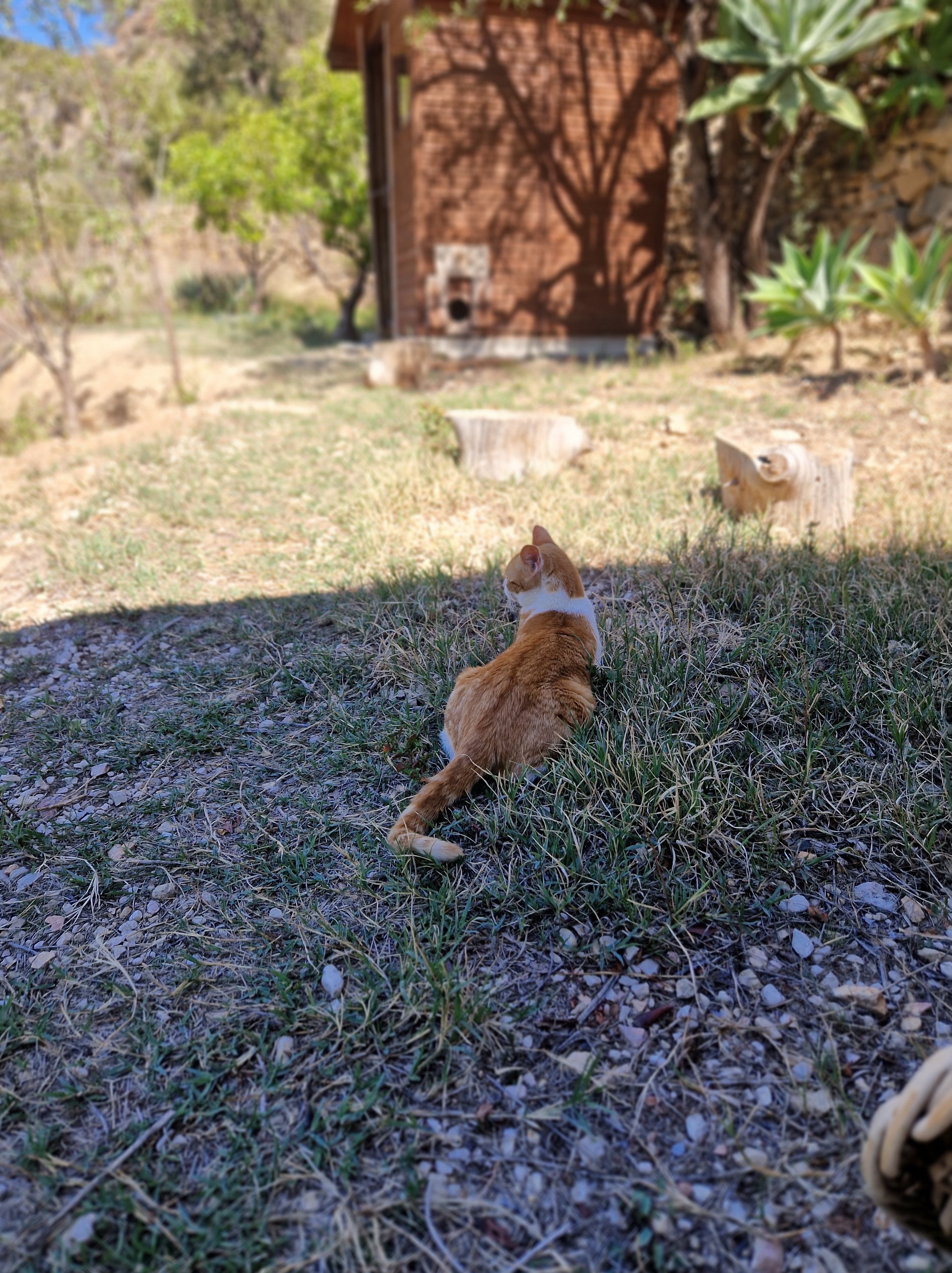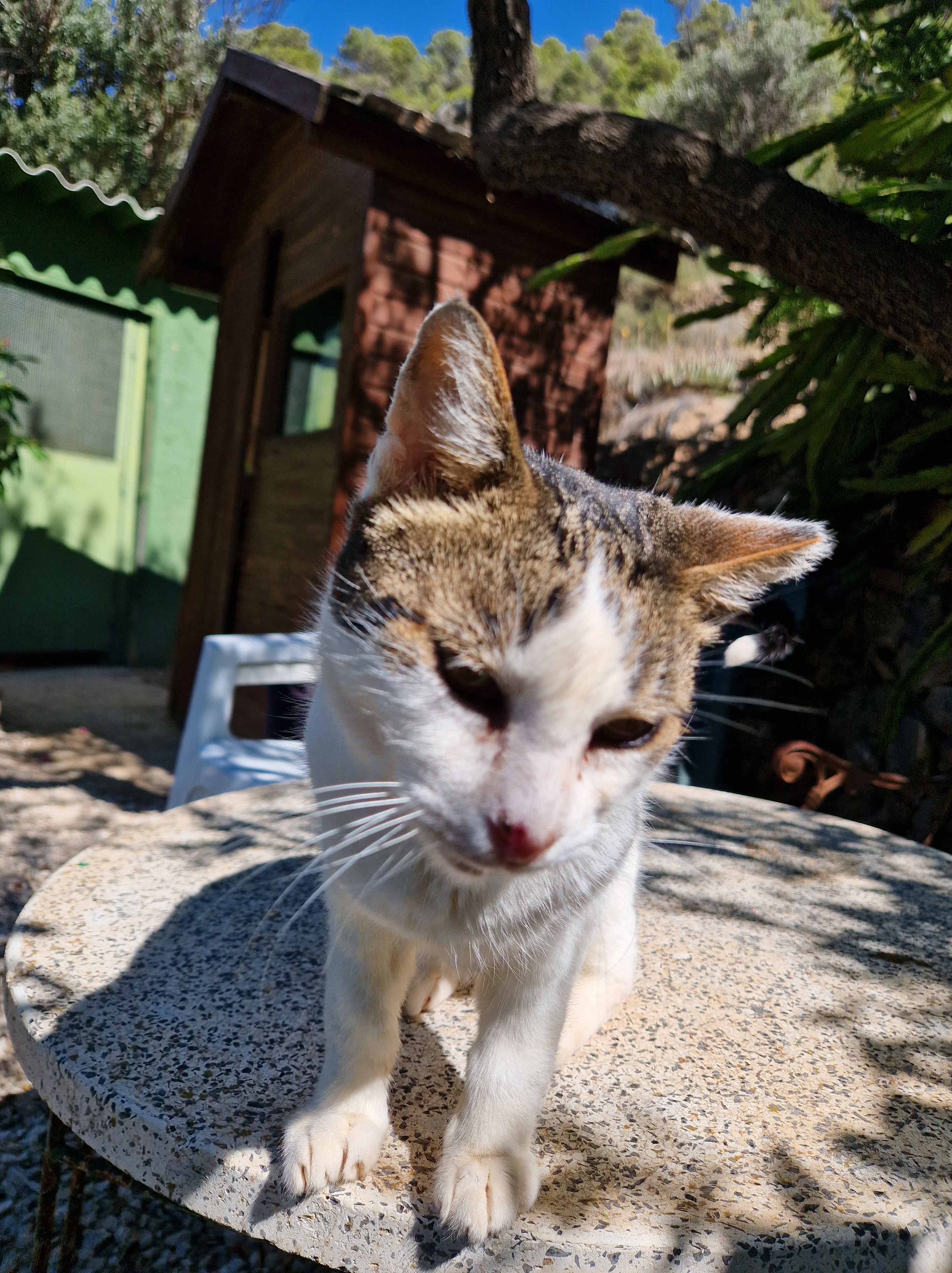 Am nächsten Morgen um 9:00 Uhr ging es nach einem kurzen Frühstück in unserem Stammcafé mit dem Auto los nach Sella zu Edith. Wir haben uns auf ihrer Finca verabredet und einige Pläne für den Tag gemacht. Edith hat uns auf einem Parkplatz kurz vor ihrer Einfahrt abgeholt, sodass wir den – doch recht abenteuerlichen – Weg zu Ihrer Finca nicht selber fahren mussten. Es ist schon unglaublich, was Edith jeden Tag leistet und vor allem jeden Tag fährt. Das würde sich nicht jeder zutrauen, denn es handelt sich bei der Zufahrt nicht um eine gepflasterte Straße, sondern um eine unbefestigte, schmale, extrem huckelige Piste. Auf der Finca angekommen, waren wir sehr beeindruckt von der schönen und gepflegten Anlage. Edith hält hier mehr oder weniger alles alleine in Schuss. Ihre Katzen waren ausgezogen und unterwegs aber Stefan (wir haben vor Jahren einen Spendenaufruf für ihn eingestellt und er konnte mit Eurer Hilfe operiert werden) hat uns begrüßt und sich ausgiebig kuscheln lassen. Zum Glück hat Edith aktuell nicht viele Katzen dort aber ein paar Notfälle waren natürlich schon in ihrer Obhut, auch zwei Miezen oben in den Käfigen und eine Mutter mit ihren Kitten, die Edith gerade päppelt.